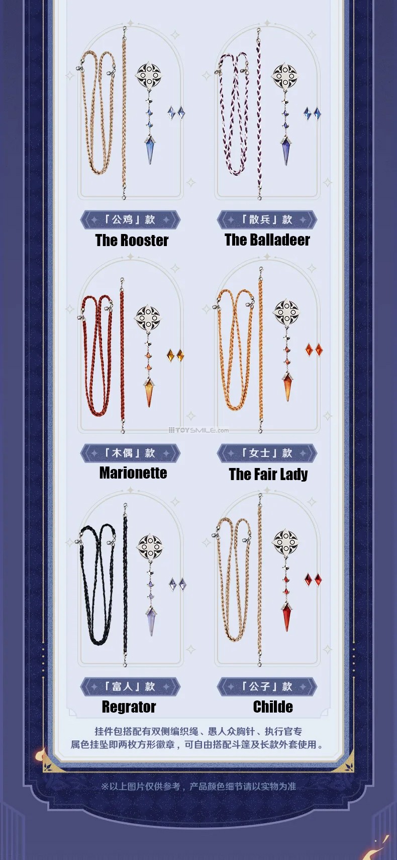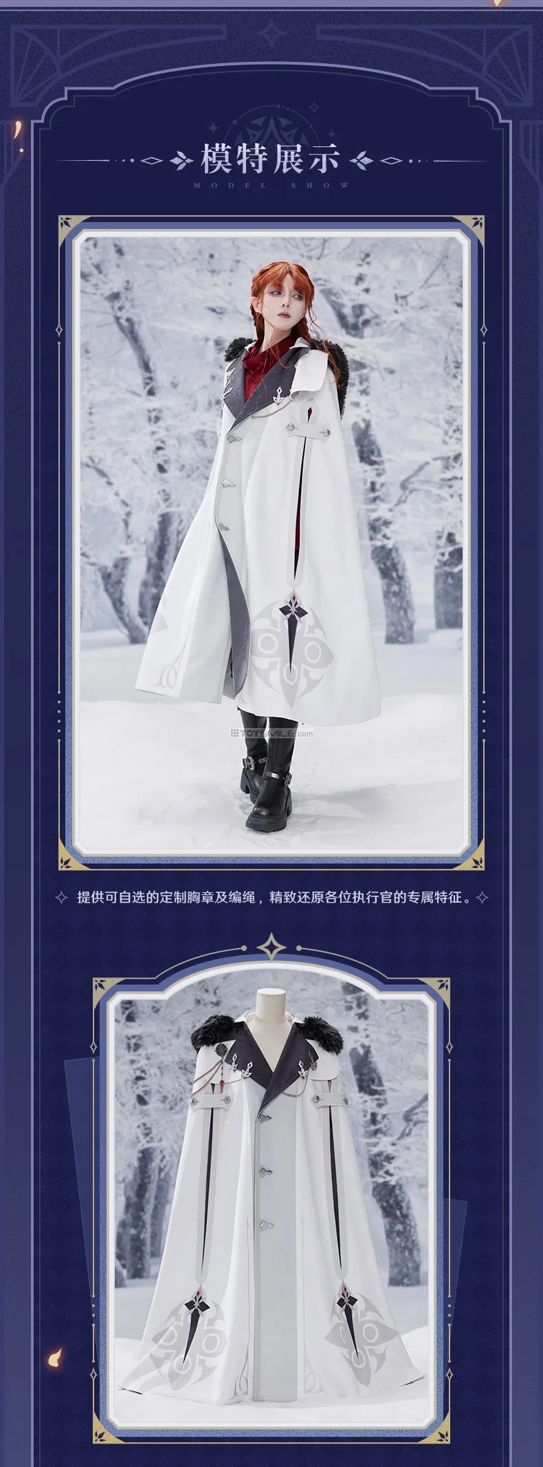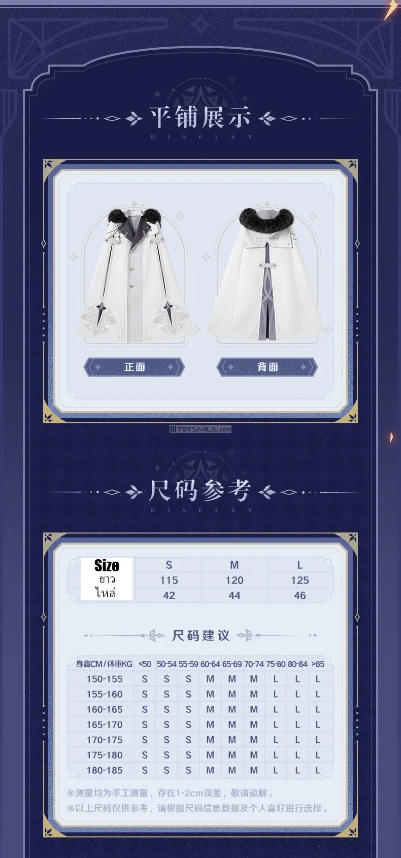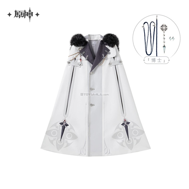 Genshin Impact Frost & Flame Fatui Harbinger’s Cloak Material Fabric: 95.8% polyester fiber,4.2% spandex Stitching: 100% polyester fiber Lining: 100% polyester fiber Design Fit: Loose Elasticity: Slight elasticity Thickness: Moderate Length: Slightly long Including: Genshin Impact Frost & Flame Series Brooch & Accessories Set Set Contents: Woven rope , Fatui’s brooch with Harbinger’s pendant and diamond-shape badge x2 Material Brooch: Zinc alloy, resin Diamond-shaped ornament: Zinc alloy, glass Rope: Polyester fiber Dimensions Brooch metal part: Approx. 4.6 cm Left collar rope: Approx. 27 cm (including lobster clasp) Right collar rope set: Approx. 35.5 cm + 48 cm Diamond-shaped ornament: Approx. 2.4 × 1.4 cm กำหนดจำหน่าย 01/2026 *สินค้าออฟฟิเชียล ลิขสิทธิ์แท้