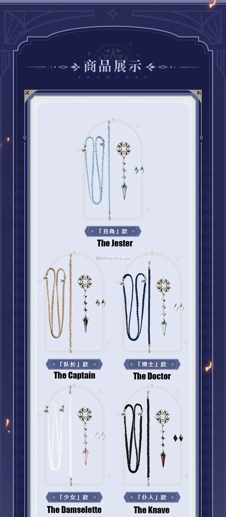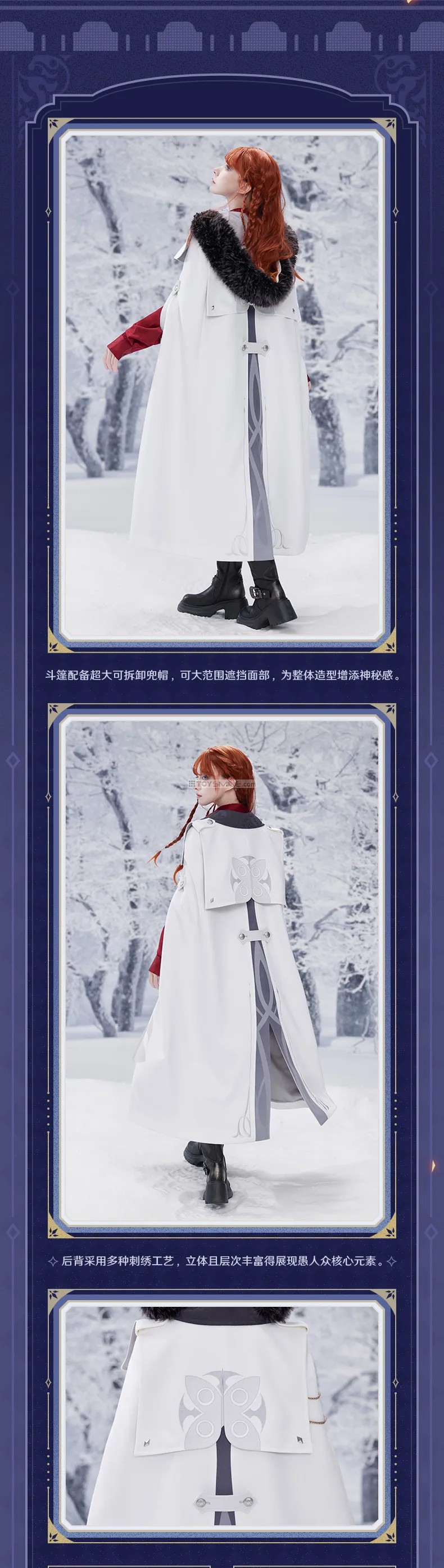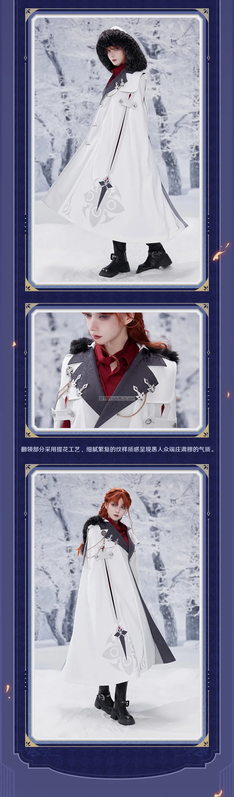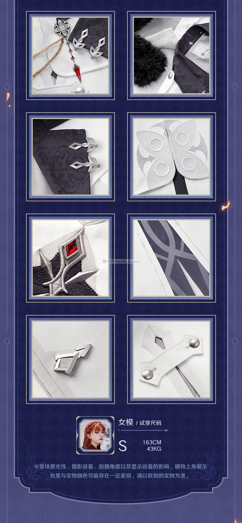 Genshin Impact Frost & Flame Fatui Harbinger’s Cloak Material Fabric: 95.8% polyester fiber,4.2% spandex Stitching: 100% polyester fiber Lining: 100% polyester fiber Design Fit: Loose Elasticity: Slight elasticity Thickness: Moderate Length: Slightly long Including: Genshin Impact Frost & Flame Series Brooch & Accessories Set Set Contents: Woven rope , Fatui’s brooch with Harbinger’s pendant and diamond-shape badge x2 Material Brooch: Zinc alloy, resin Diamond-shaped ornament: Zinc alloy, glass Rope: Polyester fiber Dimensions Brooch metal part: Approx. 4.6 cm Left collar rope: Approx. 27 cm (including lobster clasp) Right collar rope set: Approx. 35.5 cm + 48 cm Diamond-shaped ornament: Approx. 2.4 × 1.4 cm กำหนดจำหน่าย 01/2026 *สินค้าออฟฟิเชียล ลิขสิทธิ์แท้