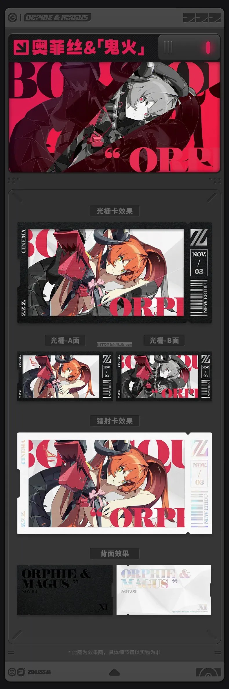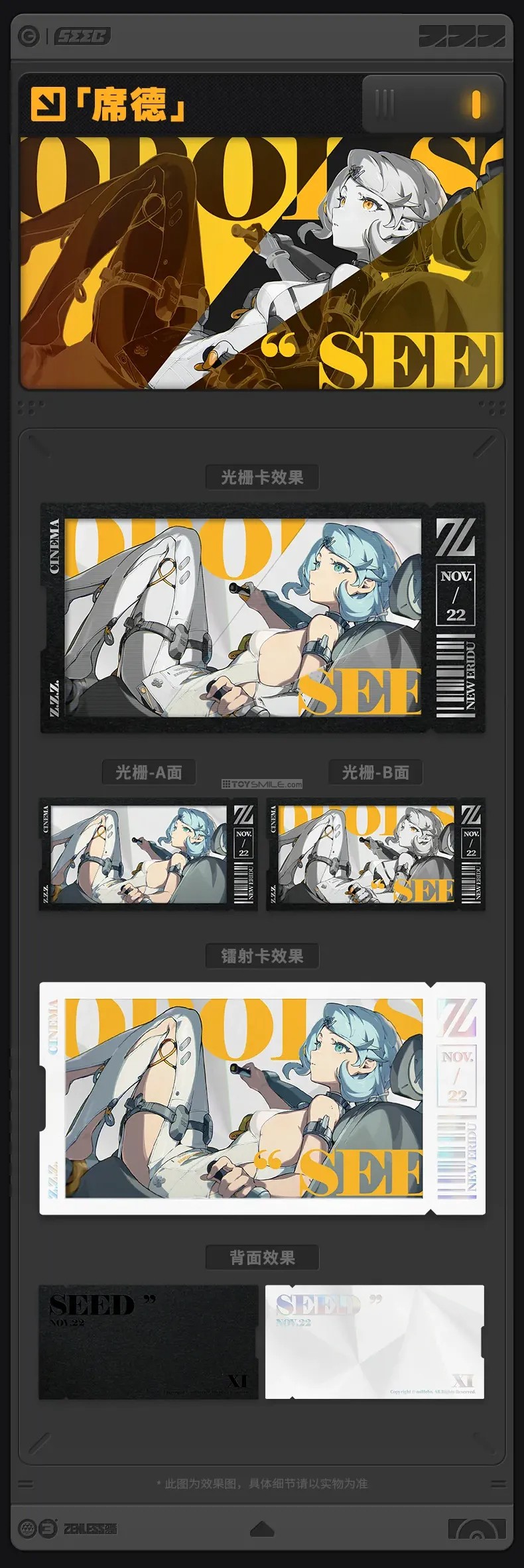 Zenless Zone Zero Mindscape Cinema Collectible Card: Obol Squad In display order: Seed (「席德」) Orphie & Magus (奥菲丝 &「鬼火」) Soldier 11 (「11号」) Trigger (「扳机」) Set Contents: Lenticular Card x1, Laser Effect Card x1 Material: high grade special paper Craft: lenticular printing, silver stamping, laser stamping Dimensions: approx. 150 x 78mm Packaging: PVC ticket holder, OPP bag *สินค้าลิขสิทธิ์แท้ออฟฟิเชียล